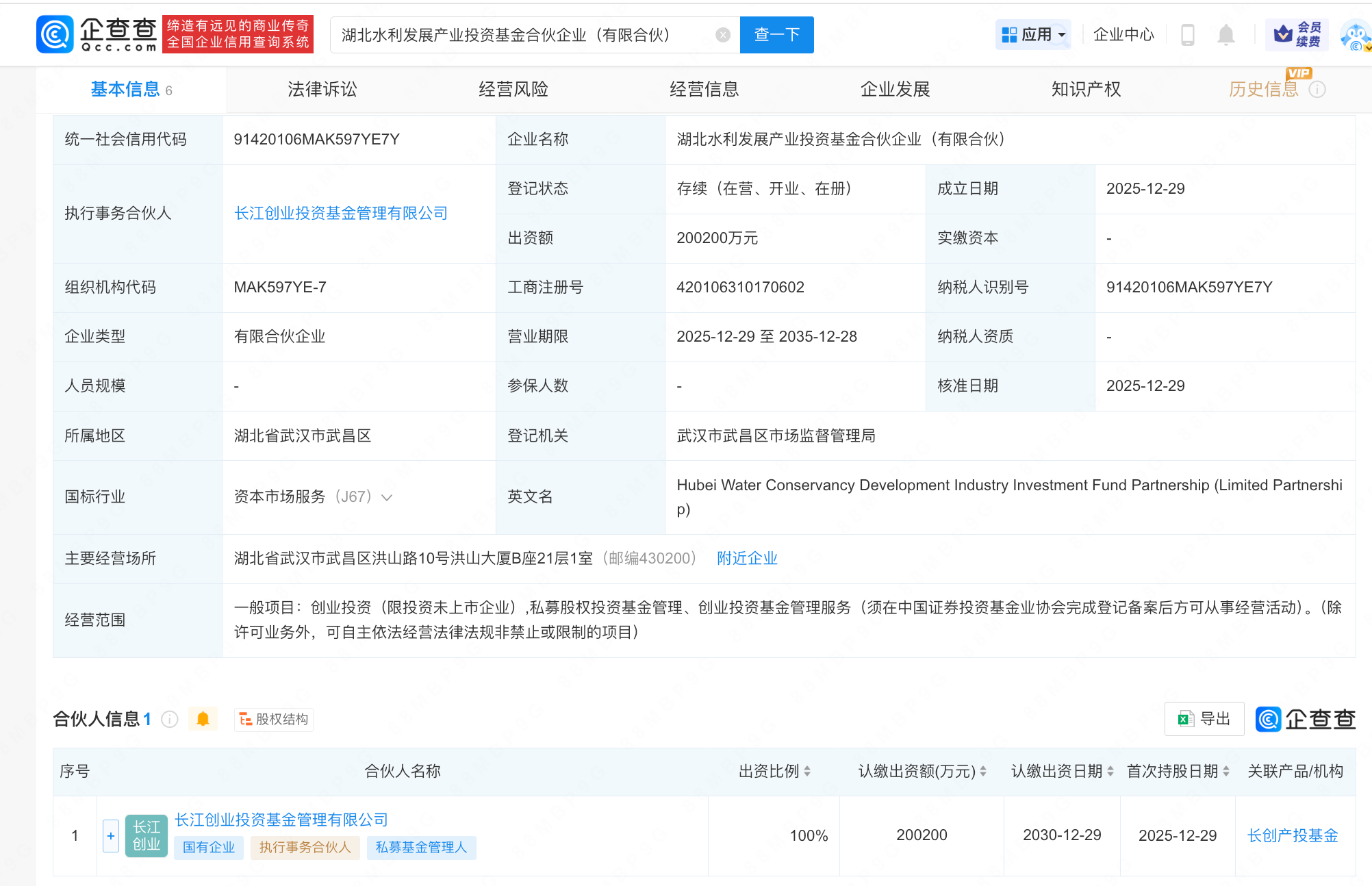 近日,湖北水利发展产业投资基金合伙企业(有限合伙)成立,执行事务合伙人为长江创业投资基金管理有限公司,出资额约20亿人民币,经营范围为创业投资,私募股权投资基金管理、创业投资基金管理服务。企查查股权穿透显示,该基金由长江创业投资基金管理有限公司全资持股。