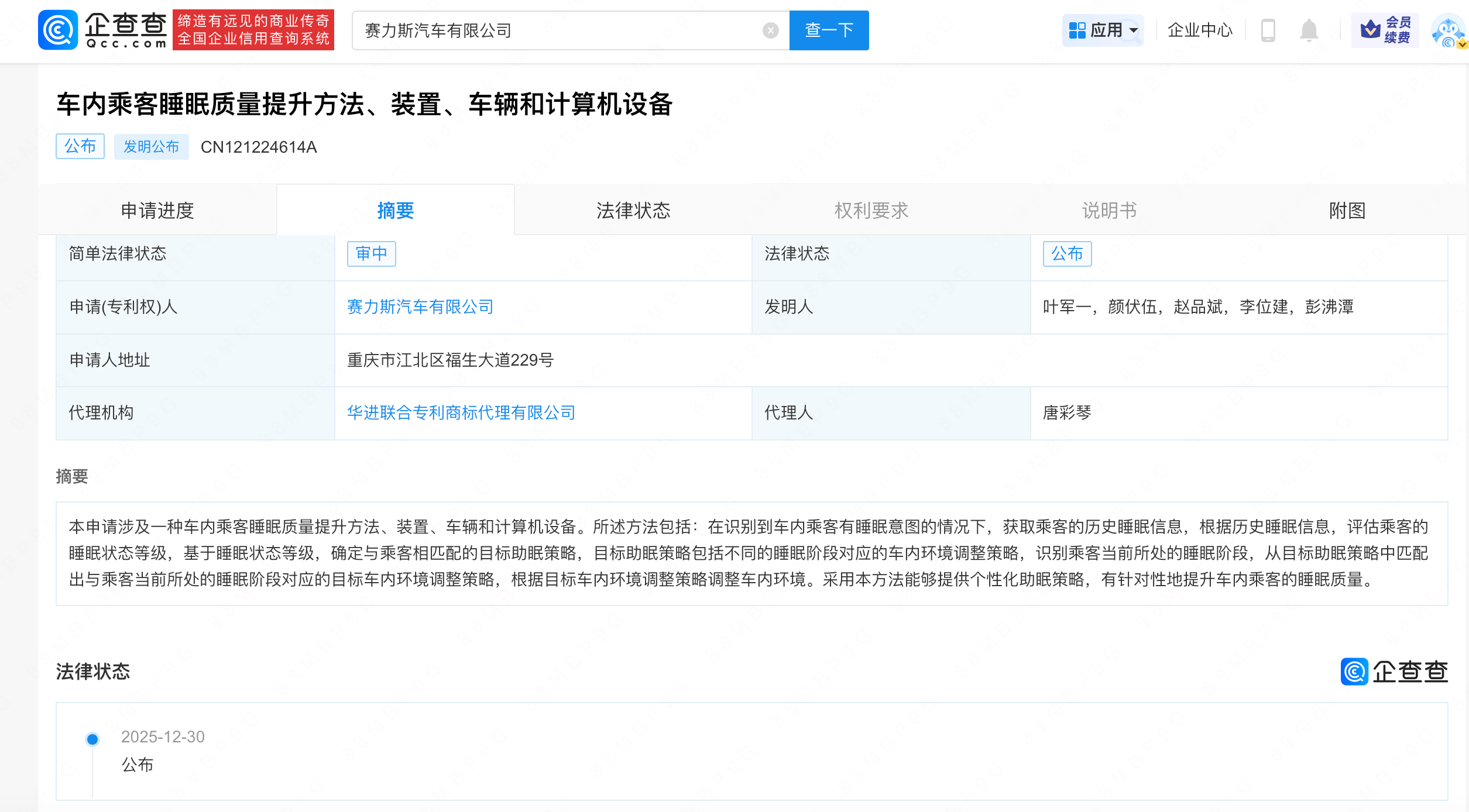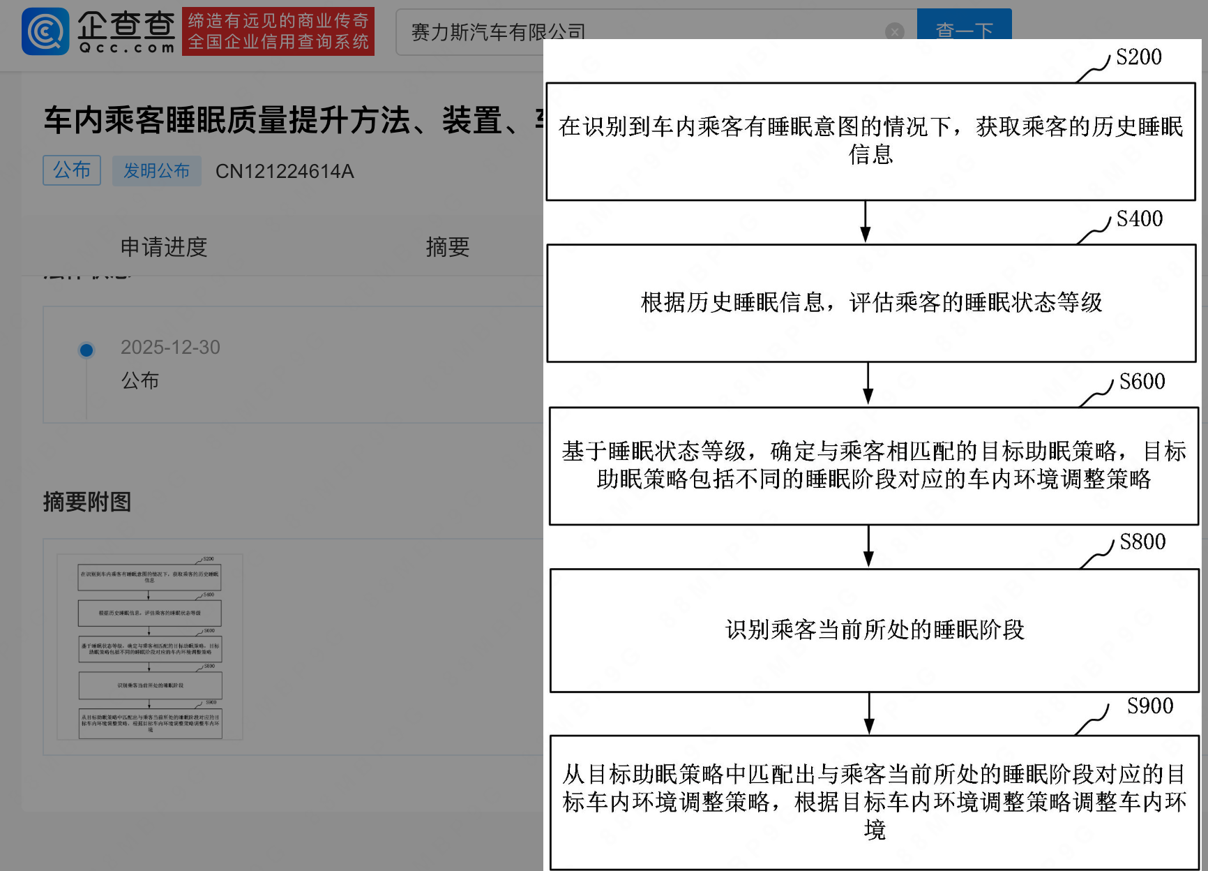 近日,赛力斯汽车有限公司申请的“车内乘客睡眠质量提升方法、装置、车辆和计算机设备”专利公布。摘要显示,本申请涉及一种车内乘客睡眠质量提升方法、装置、车辆和计算机设备。所述方法包括:在识别到车内乘客有睡眠意图的情况下,获取乘客的历史睡眠信息,根据历史睡眠信息,评估乘客的睡眠状态等级,基于睡眠状态等级,确定与乘客相匹配的目标助眠策略,目标助眠策略包括不同的睡眠阶段对应的车内环境调整策略,识别乘客当前所处的睡眠阶段,从目标助眠策略中匹配出与乘客当前所处的睡眠阶段对应的目标车内环境调整策略,根据目标车内环境调整策略调整车内环境。采用本方法能够提供个性化助眠策略,有针对性地提升车内乘客的睡眠质量。