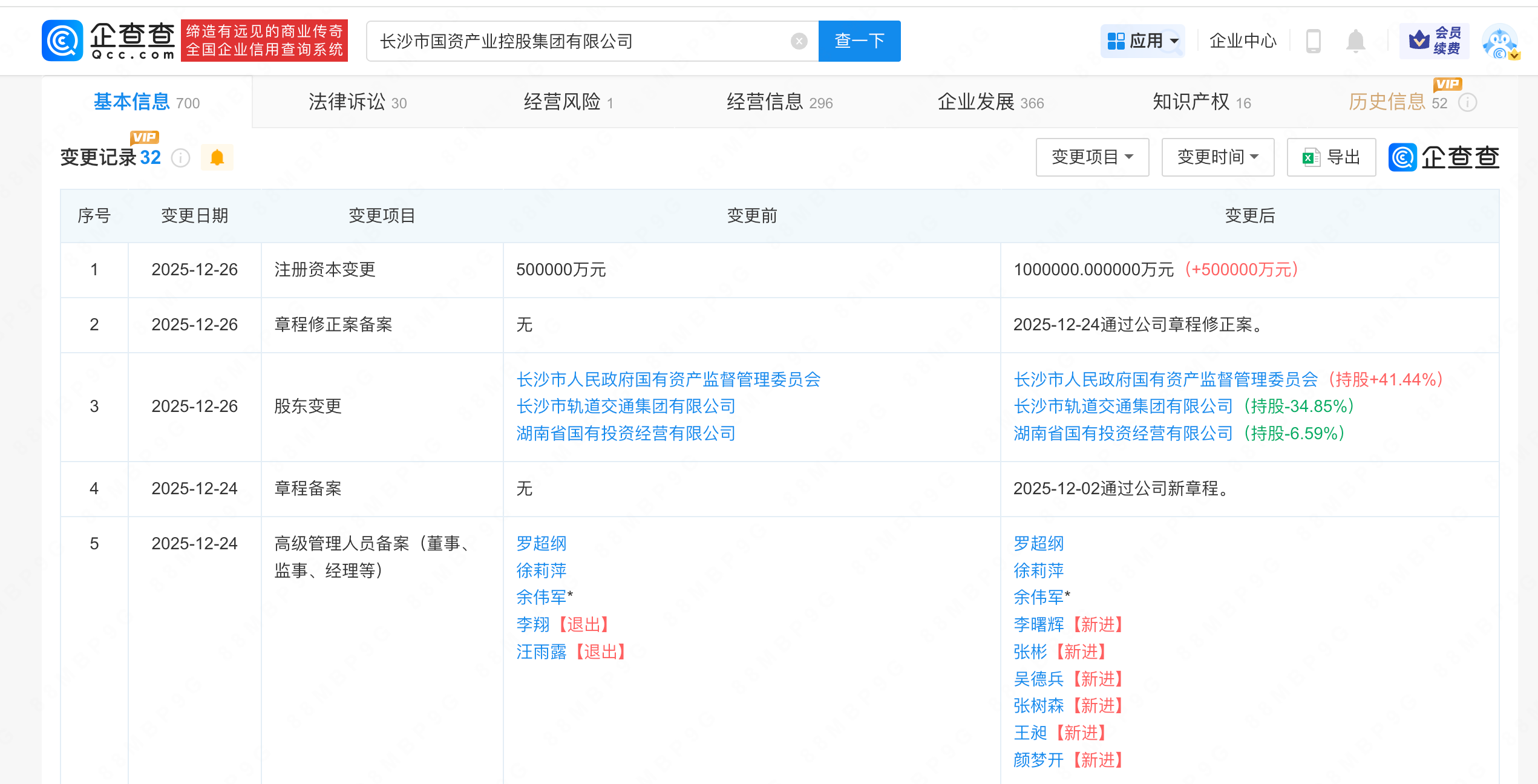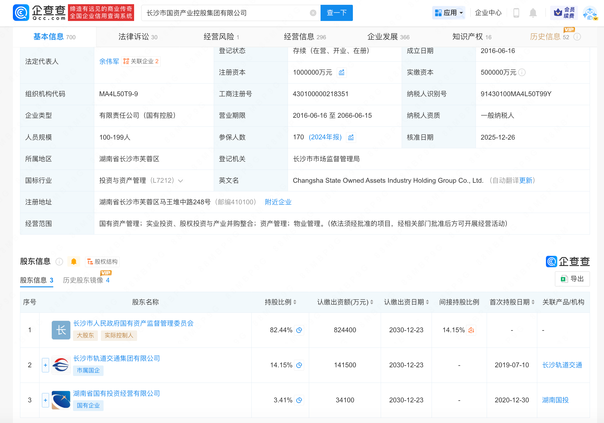 近日,长沙市国资产业控股集团有限公司发生工商变更,注册资本由50亿人民币增至100亿人民币,增幅100%。企查查信息显示,该公司成立于2016年6月,法定代表人为余伟军,经营范围为国有资产管理,实业投资、股权投资与产业并购整合,资产管理,物业管理,由长沙市人民政府国有资产监督管理委员会、长沙市轨道交通集团有限公司、湖南省国有投资经营有限公司共同持股。